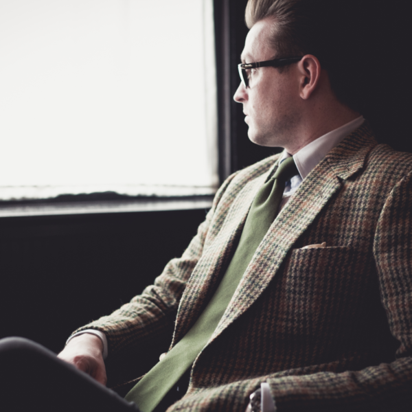 We’re still about a month away from fall, but I’m already thinking about heavy flannels and thick coats. Derek from Nashville  provides some nice inspiration. Here he’s wearing a houndstooth checked tweed sport coat from Martin Greenfield, an oxford cloth button down shirt from Kamakura, and a solid, olive green wool challis tie from Sam Hober. The combination of textures keeps things visually warm and interesting, while the pattern on the jacket adds a little variation to an otherwise solid-colored ensemble. You can’t tell from the photo, but the shirt is actually light blue, not white, which makes for a nice complement to the rustic browns, oranges, and greens that Derek is wearing. I imagine on his feet are brown suede shoes.