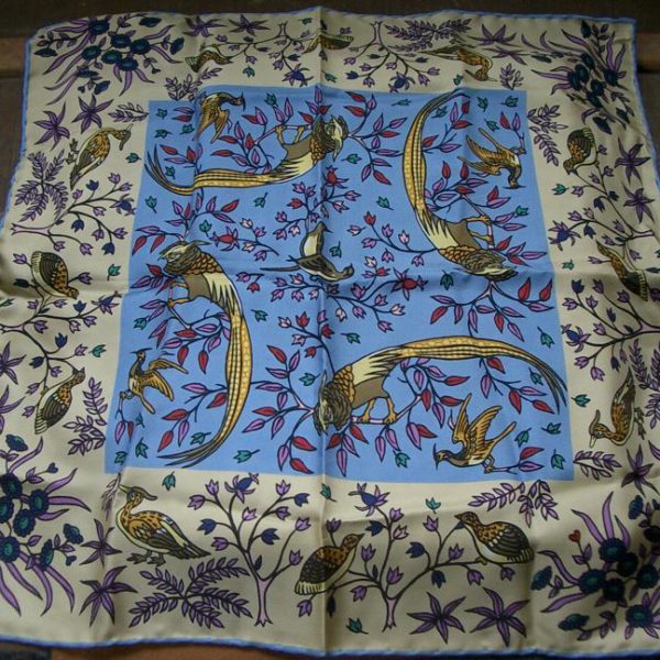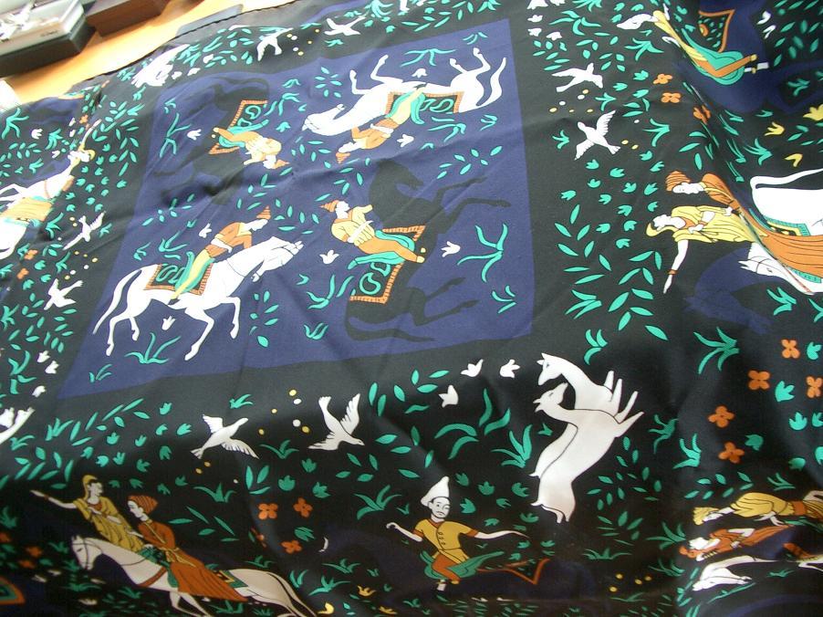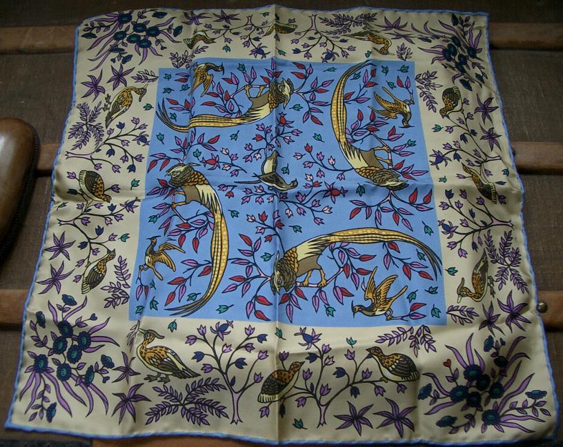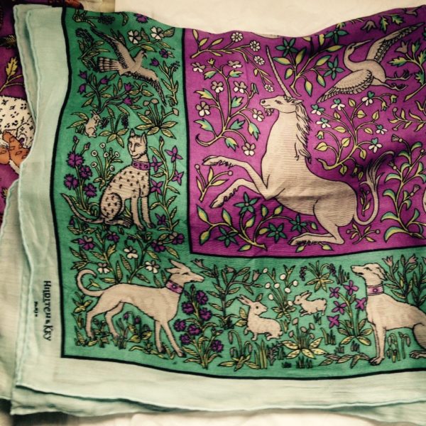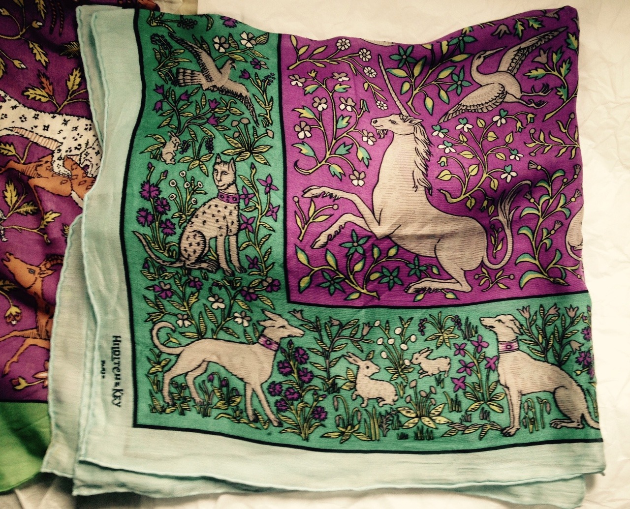 Pictured above: Old scarves, mostly from Hilditch & Key Paris. Interesting how some of the designs look very much like modern Drake’s pocket squares. Compare, for example, these two floral prints, the similar mogul designs, these two pieces featuring leopards hunting antelopes, and of course the famous La Dame à la licorne inspired prints.