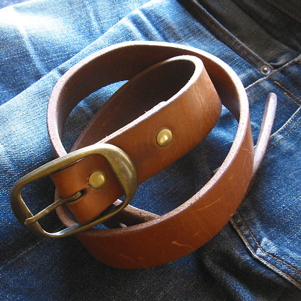 There’s probably a theory about why a guy my size would like such rugged belts (overcompensating for something, perhaps?), but regardless – lately I’ve come to really like Don’t Mourn Organize, a small, one-man operation based in Utah that makes custom leather goods. Eight months ago, I had Scott, the owner of the company, make me a harness leather belt cut to a 0.25” thickness. It’s thicker than your average belt, but not so thick that it’d be too tough to break in. The color of the leather was originally an unwearable pale beige, but quickly darkened to a light brown after I applied two or three coats of Obeanuf’s LP. It’s since darkened further, to a solid mid-shade of brown, after eights months of regular wear and use. You can see how it looks now in the photo above.