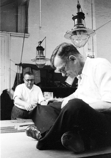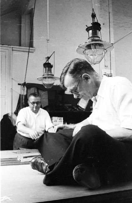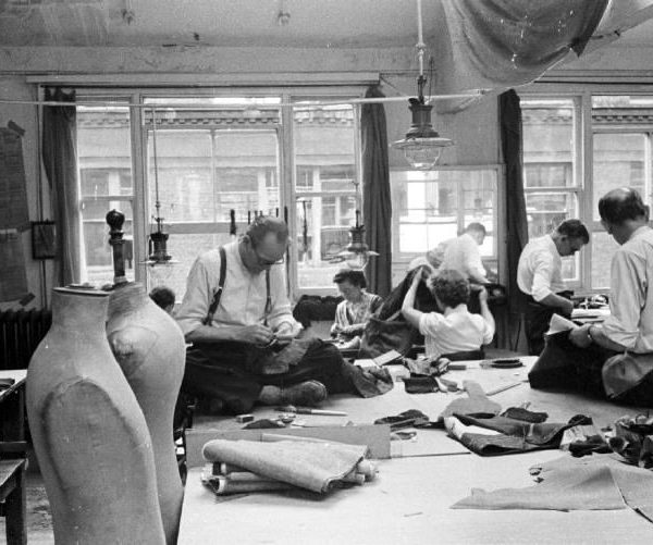 My friend CrimsonSox found some wonderful images of H. Huntsman & Sons in 1957. Notice how all the tailors are sitting cross-legged on tables while they work. Tailors used to sit like this for hours, which is why so many came out of the trade with physical ailments. There’s actually a muscle in our body called the sartorius muscle, which runs down the length of our thigh. Sartorius comes from the Latin word sartor, meaning tailor, and it’s sometimes referred to as the tailor’s muscle.