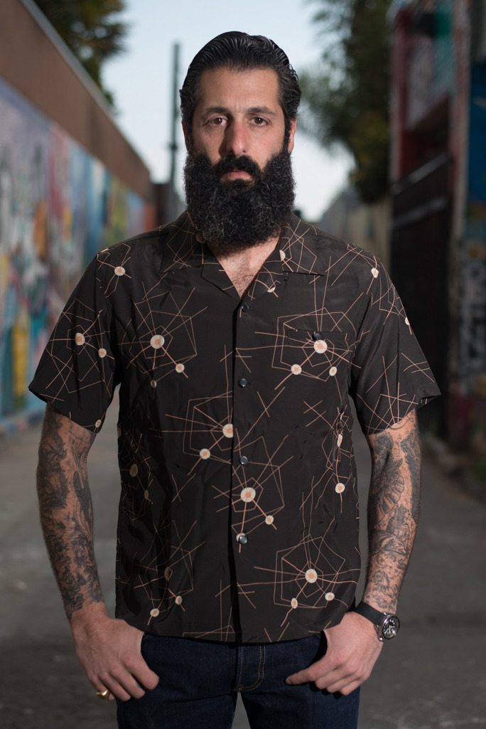 - Star of Hollywood Atomic Shirt ($160): Star of Hollywood is an old 1950s brand known for its outlandish rockabilly, atomic, and Aloha style shirts. Their styles have become popular among guys who like a retro look, but they can also be hard to find. Toyo Enterprises in Japan, however, has licensed the name and brought back some of their favorite pieces. I like the idea of this shirt with a black leather jacket and black jeans.