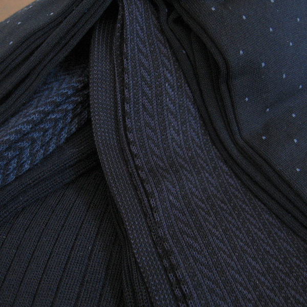 For some bit of a visual interest, a few of my socks feature subtle, conservative patterns. Above are pin dots and herringbones by Marcoliani, and a pair of “slash fashion herringbone” by Bresciani. Marcoliani’s herringbone borders on slightly too bright, but I think they still work with slightly more casual ensembles. The others are dark and subtle enough that they could work with almost anything except a business suit. I wear these under dark olive glen plaid, charcoal windowpane, and plain mid-grey flannel trousers. I think they’re a nice way to have fun with your socks without crossing over into wacky.