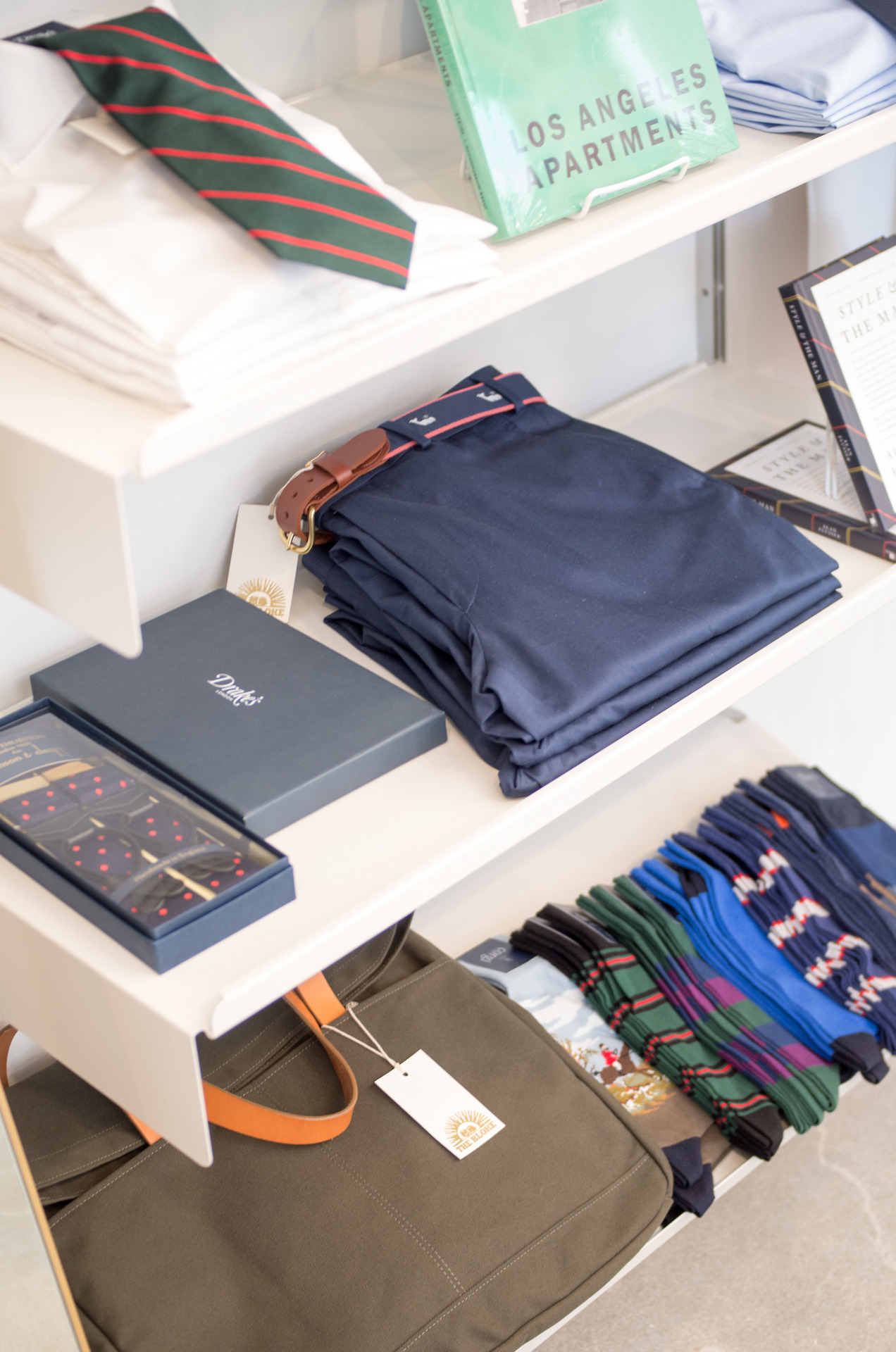 The square footage isn’t huge, but I found shirts and ties from Drake’s, sleepwear from Hilditch & Key and trousers from Tellason among the options on display. There were Sanders Playboy chukkas, a few Alden models and hats (I bought one) from the British stalwart Bates. There are also a few preppy classics, like some killer needlepoint belts and a rack of vintage club ties.