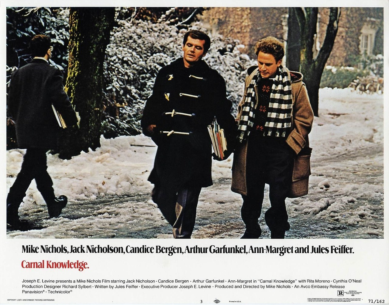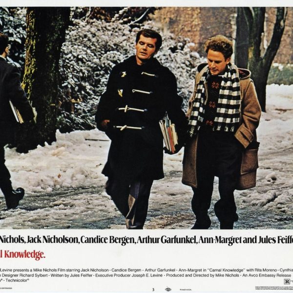 - Carnal Knowledge (1971)–In this Mike Nichols film, Nicholson and Art Garfunkel play Amherst classmates, so you get the sort of Ivy/preppy wardrobe you might expect–great duffel coats, shetlands, and buttondown collars. As in many of these films, Nicholson’s character is essentially an asshole.