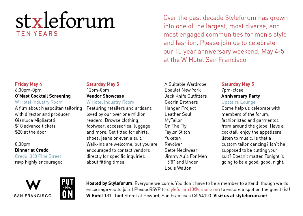 In case you live under a rock and haven’t heard, StyleForum is having their 10th anniversary party at the W Hotel in San Francisco on May 4th and 5th, and Put This On is proud to be a sponsor of the event!