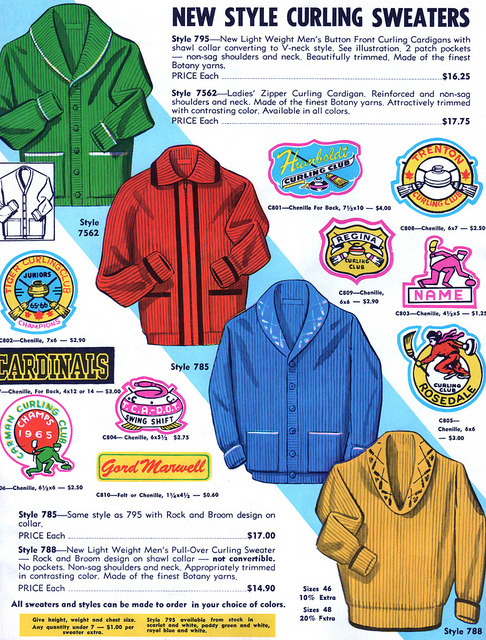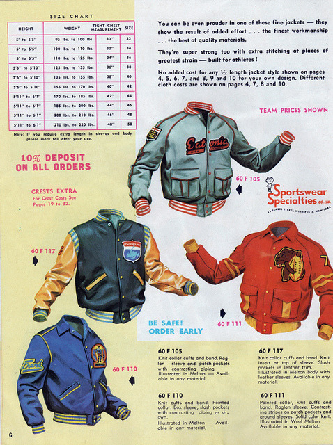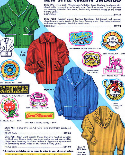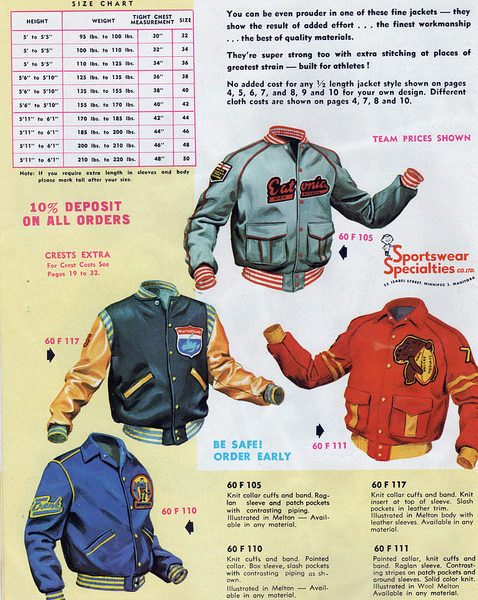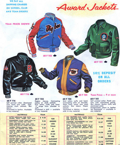 The amazing sports uniform blog Uni Watch has a great set of scans from a 1965 varsity jacket catalog. (In high school, I lettered in cutting class to go get salami sandwiches.)