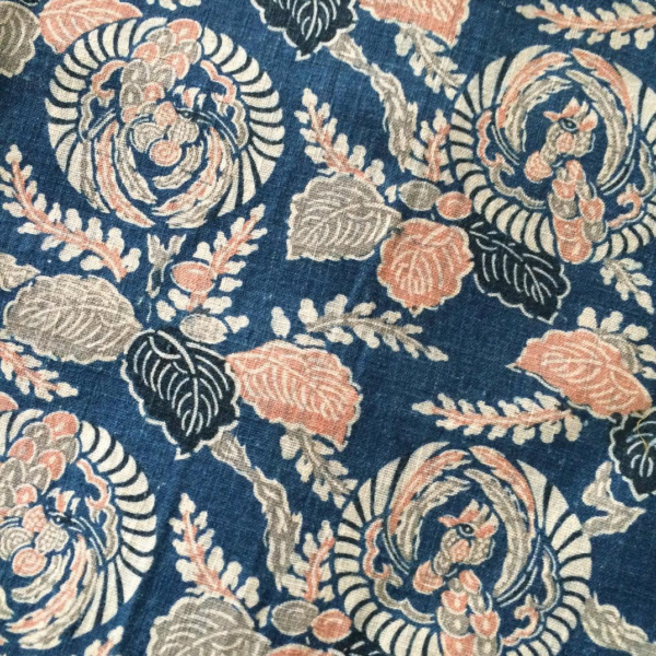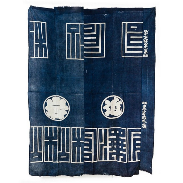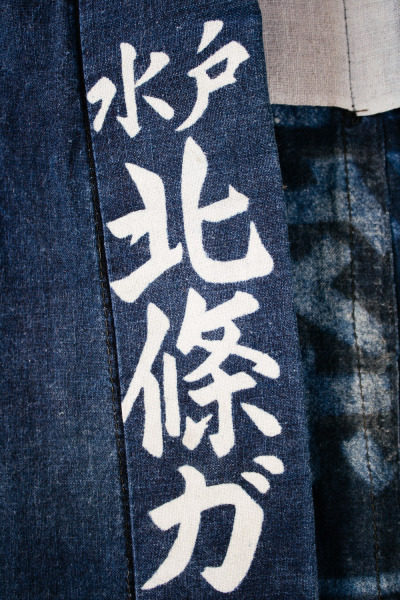 Pictured above: Some lengths of hand-woven cottons, made out of hand-spun materials, that have been stenciled and then resist-dyed. Japanese textiles often feature petalled designs found in nature. The chrysanthemums in the top image, for example, are celebrated in Japan as a symbol of longevity. In the middle photo, we have a haten jacket, which features the Chinese zodiac kanji character for pig.