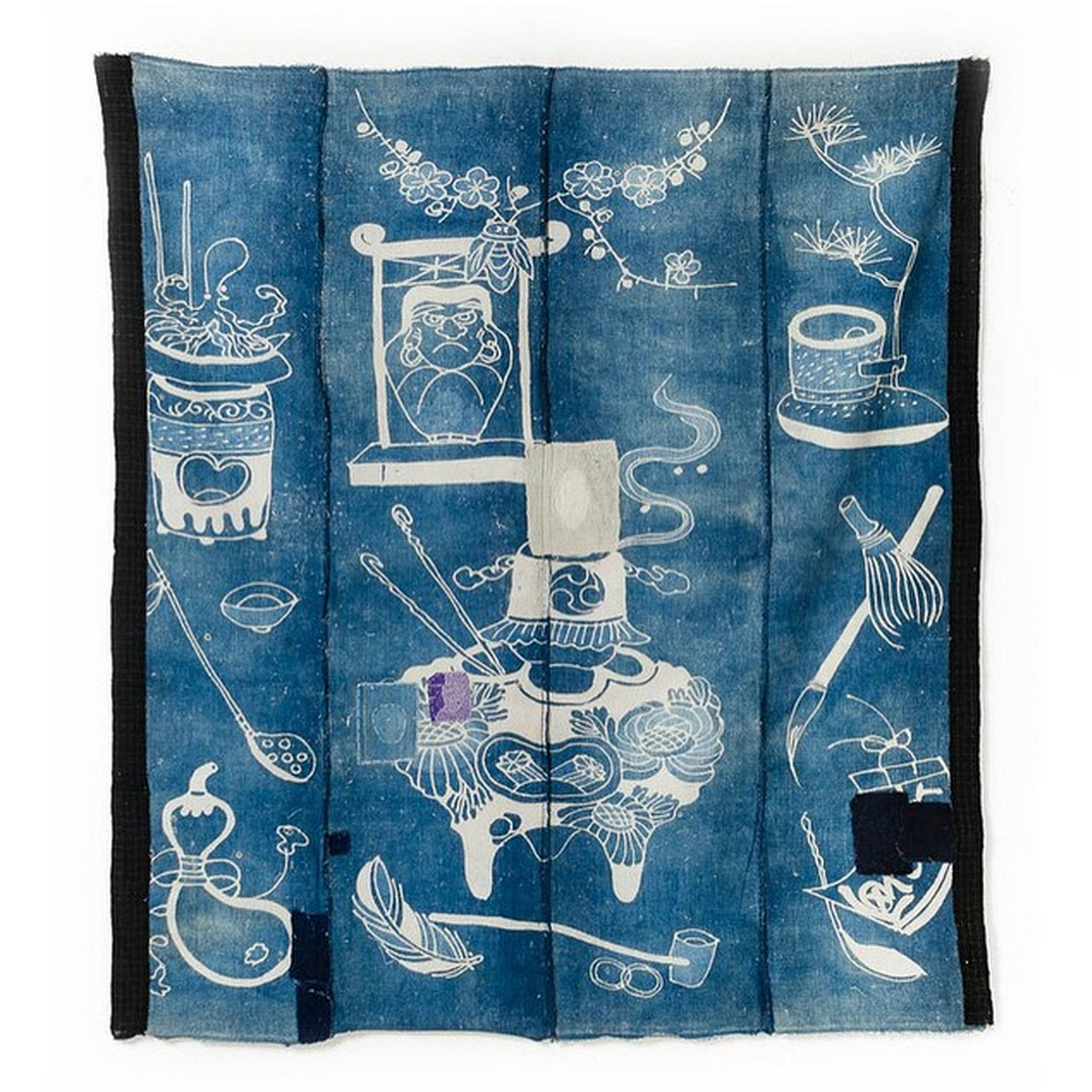 Pictured above: A work jacket and futon cover. The cover is decorated with various elements from Japanese tea ceremonies – tea whisks, water ladles, hanging scrolls, calligraphy brushes, and floral arrangements. Futons decorated in this fashion were often given as part of a wedding trousseau to a new bride and groom.
