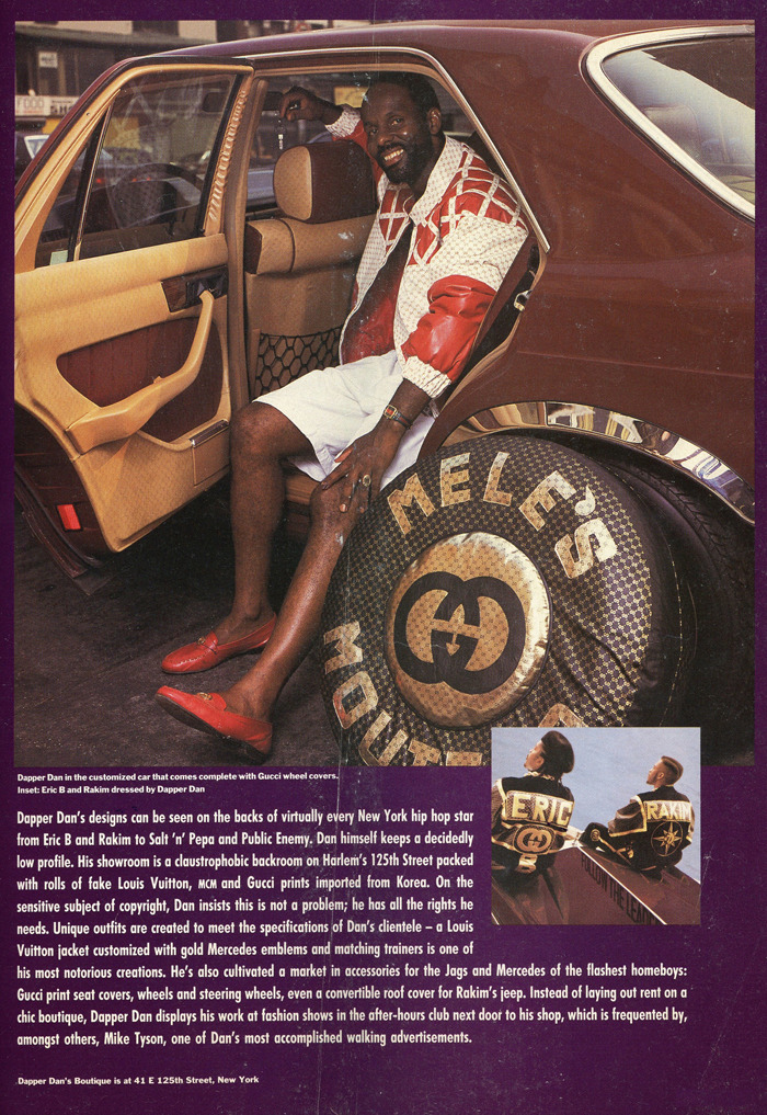The New York Times has a great article on Dapper Dan, the Harlem clothier who’s dressed everyone from LL Cool J to Mike Tyson. In the 1980s, Dapper Dan made his name on selling a kind of flashy Harlem hustler style, which included attention grabbing suits and fur coats. Later, as his designs got bolder and bolder, he printed fake Gucci and Louis Vuitton logos on fabrics, which were then sent to local African tailors to be used for sportswear. Much of the work was custom and one-of-a-kind, which added to the appeal.