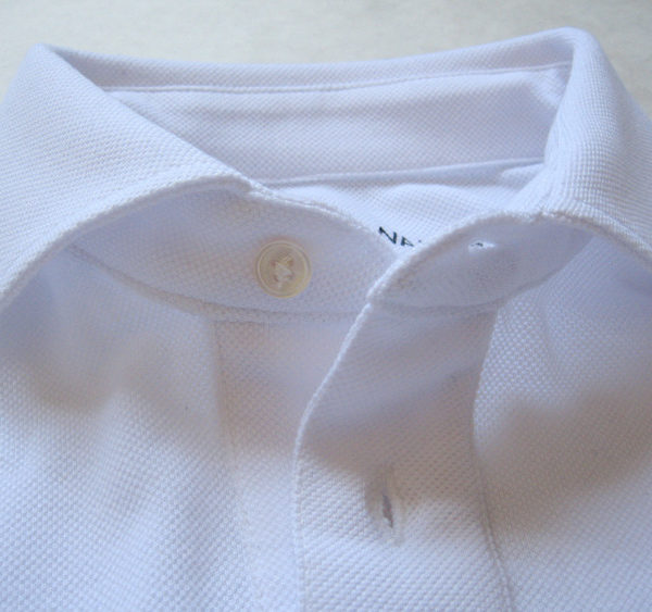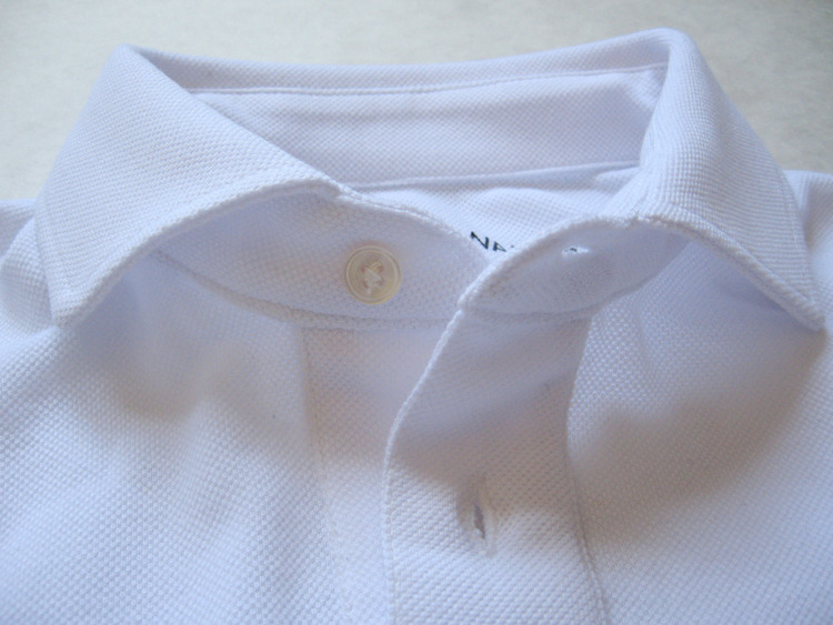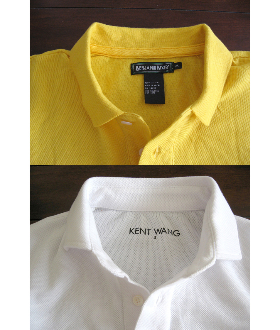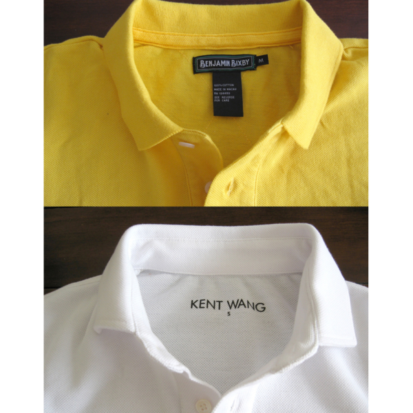 Finally, we come to Kent Wang. I was curious about Kent’s polos a few weeks ago, so I inquired about it. He was nice enough to send me one as a gift, and I received it last week. This is easily my favorite of the bunch. The real upside here is the reinforced spread collar. This means there is a collarband with two layers of self-fabric, making it the collar behave much more like one on a woven shirt (a detail that we saw earlier on the Polosophy design). In other words, the collar stands up more, instead of laying close to the collarbone. The spread collar design also gives the polo a lot more panache. I’ve taken a photo of Kent Wang’s spread collar and posted it next to a Bixby collar, which is much more traditional. You can really see the difference in collar shapes there. If you decided to get Kent’s polo, I recommend sizing up; these fit very slim.