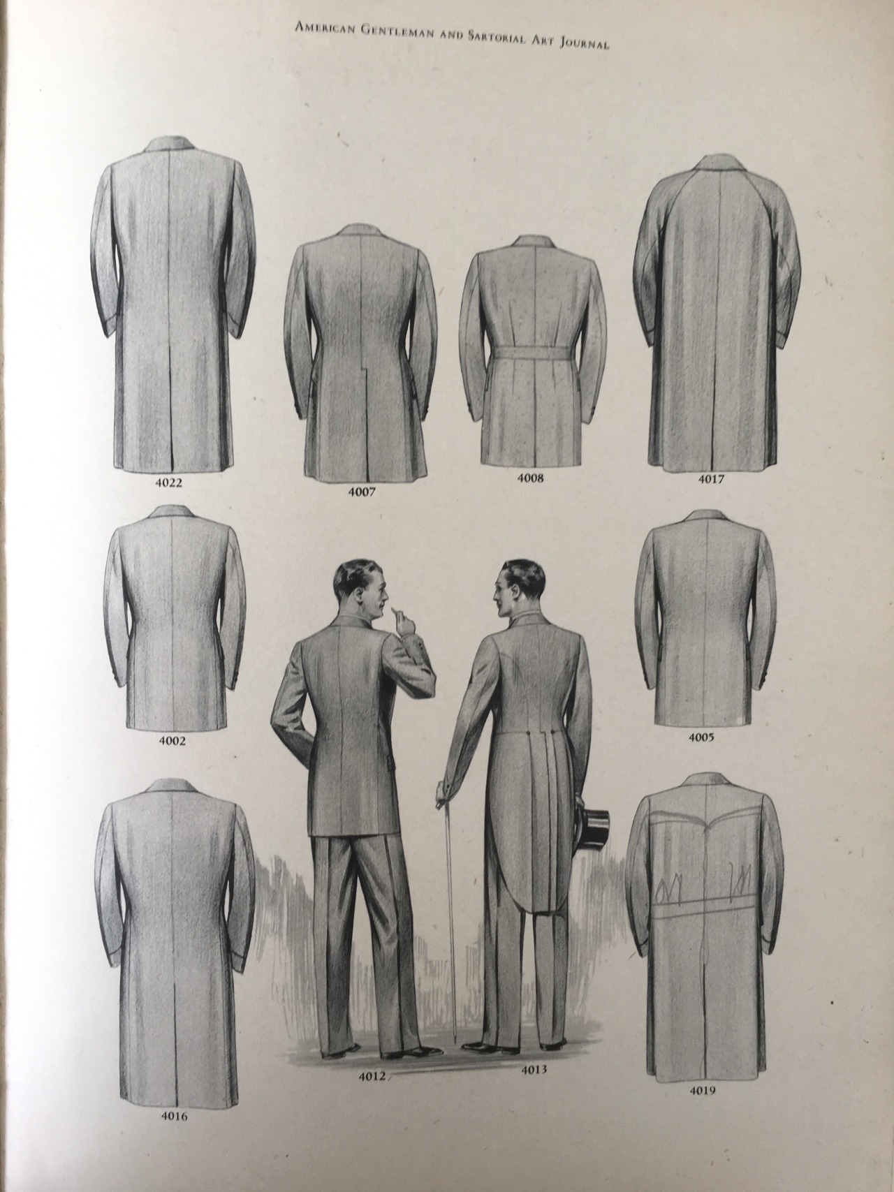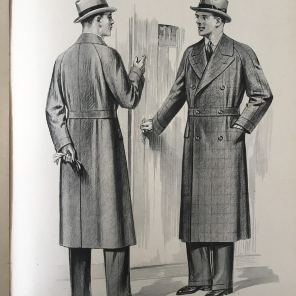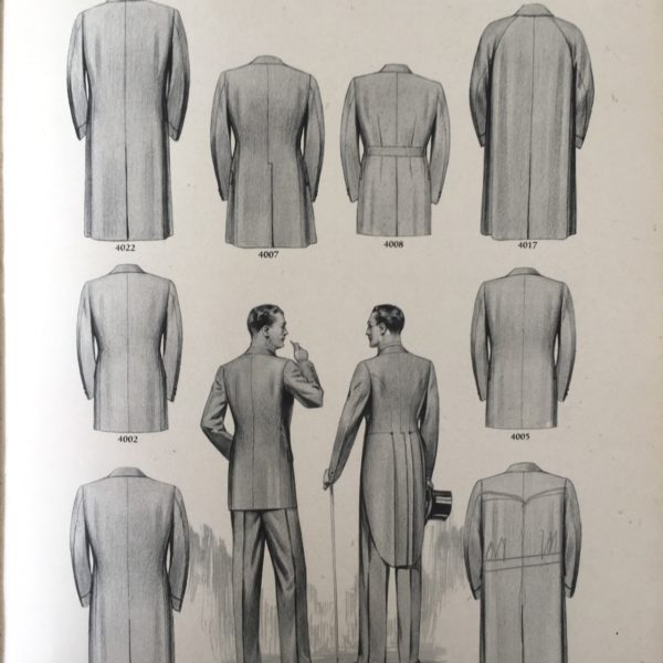 There are so many great details here: the cut of the double-breasted suit with Tautz lapels (notice how the notch goes horizontal, instead of peaking upwards). Or the classically cut, longer overcoats with belted waists. There are even a few drawings on how to draft a one-button cutaway coat (in case you need a new weekend DIY project).