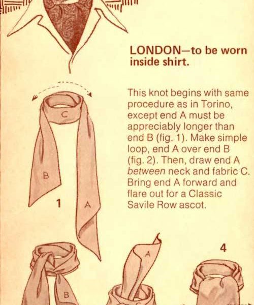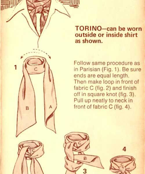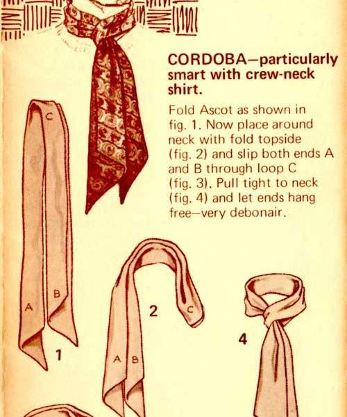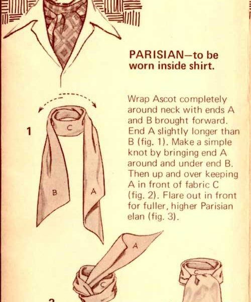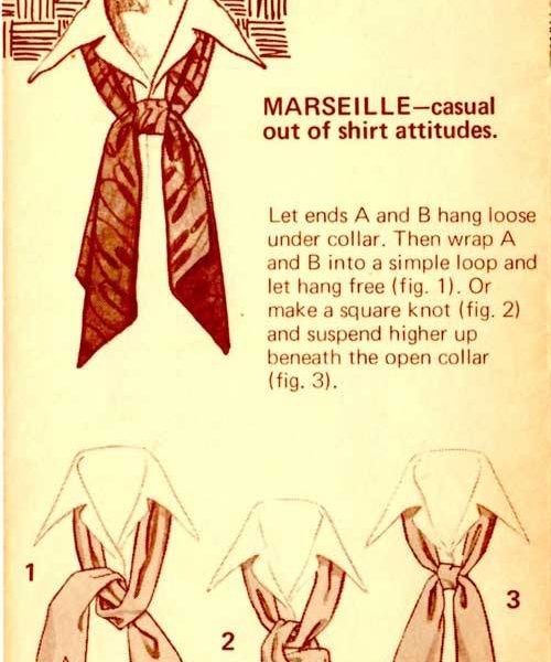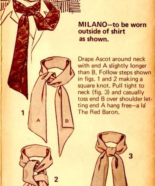 “Here’s a great new way to tie one on – with the Carre European Ascot Scarf – a silky fashion accessory that ties and knots in diverse ways. The effect? An unlimited scope of sportswear accents, ranging from the classic elegance of the English ascot to the casual insouciance of the French knot. A gamut of individual fashion expressions, decided and defined by your own imagination and a deft flick of your fingers. In a word – elegant. Casual, yet correct. To be worn with a sport shirt, a Leisure Suit or a sport jacket. Masculine flair in pure luxury.”