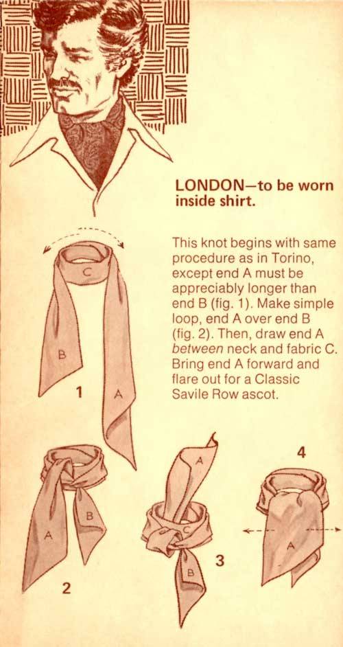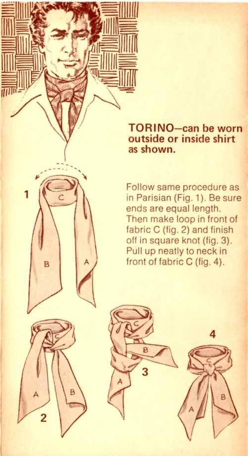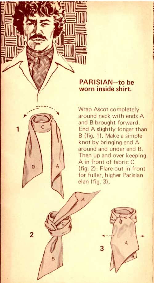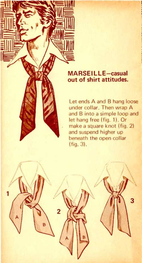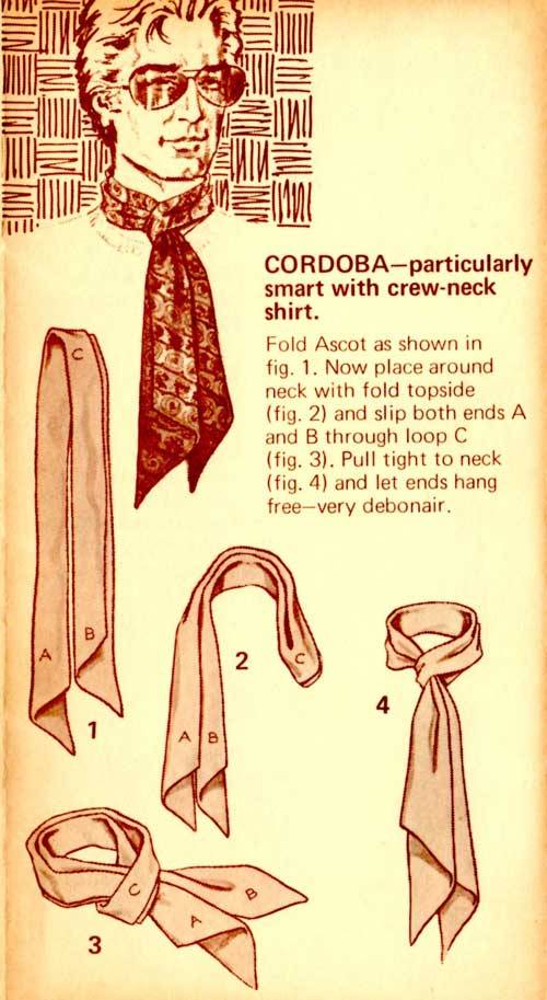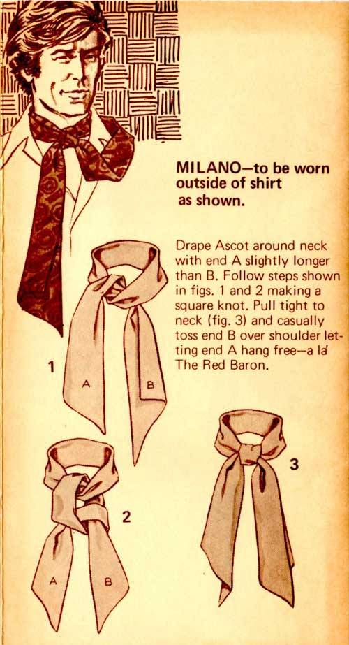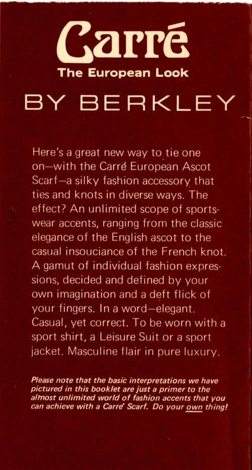 “Here’s a great new way to tie one on – with the Carre European Ascot Scarf – a silky fashion accessory that ties and knots in diverse ways. The effect? An unlimited scope of sportswear accents, ranging from the classic elegance of the English ascot to the casual insouciance of the French knot. A gamut of individual fashion expressions, decided and defined by your own imagination and a deft flick of your fingers. In a word – elegant. Casual, yet correct. To be worn with a sport shirt, a Leisure Suit or a sport jacket. Masculine flair in pure luxury.”