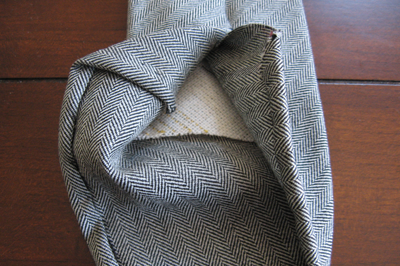 The interlining is what constitutes the "body” of most ties. If the envelope’s material is not robust, like wool or a thick silk, then it will need a wool or wool blend fabric inside, on which the envelope is folded over. Almost all luxury ties will have a pure wool interlining. This interlining helps the tie keep its shape, drape on the wearer, and shake out wrinkles after it has been worn. Remember, wool has more “memory” than silk or linen, so it can help the tie recover its original shape after its been worn. If a tie has no interlining, it will often need to be folded more than three times to give the tie some body. How many more is up to the maker and lightness of the fabric.