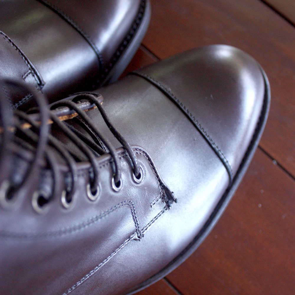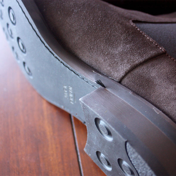 There’s also the low level of quality control. The punching on the brogues sometimes didn’t perforated all the way through, or the perforations didn’t align with the stitching. The suede Chelseas also had a bit of stitching trapped at the heel, while cap toe boots had a piece of leather that was straight breaking off from the facings. Yikes.