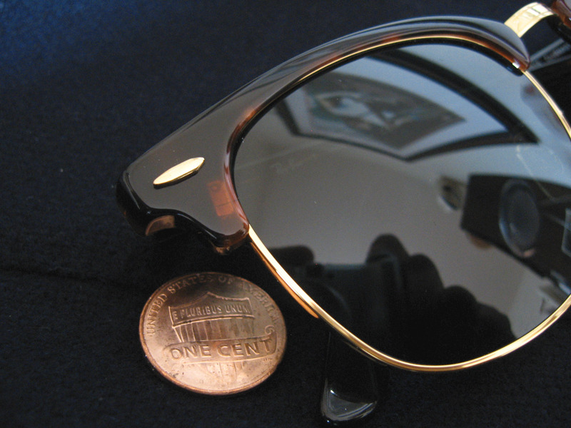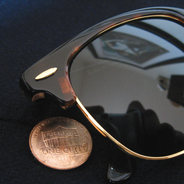 Luckily, when I bought a pair of Clubmasters two weeks ago, I remembered a little trick I learned from Mister Crew (who in turn learned it from The Trad, who in turn learned it from a few guys at Ask Andy). Apparently, back in the day, you could take off this logo with a bit of rubbing alcohol and a Q-tip. That doesn’t work anymore (as The Trad noted), but you can scratch it off with the edge of a penny. It’s a bit harder as you near the edge of the lens, but with a little persistence, you can get the whole thing off. Thirty seconds later, your Ray Bans look a ton better and you no longer have to wear a logo on your face.
