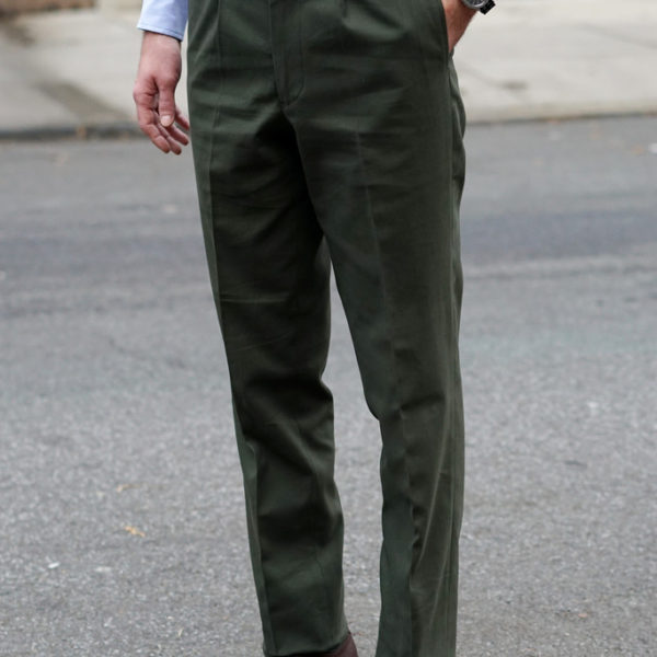 That was my first thought upon trying out Epaulet’s new “Taylor” trousers (pictured above). They’re a longer rise, pleated cotton twill trouser, and mark a sort of return to that elegant silhouette to off-the-rack pants. Derek has written  several times about the under-appreciated pleat, mostly in relation to the Armoury crew, who wear and carry some very nice fuller rise, pleated trousers (Neapolitan trouser maker Ambrosi also sells bespoke through the Armoury and does this shape very well). A trouser designed to sit at the natural waist with a pleat or two has a few clear advantages over its lower rise, flat front cousins: