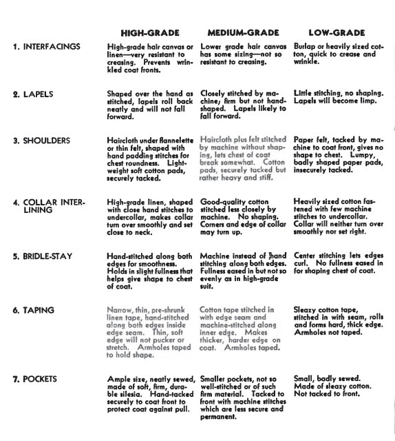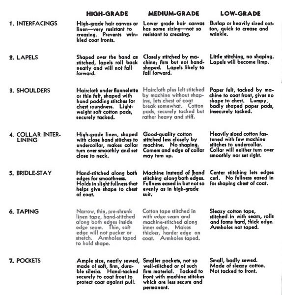 There are some things here, however, that limit this book’s practicality for today’s use. For example, there’s no discussion of fused suits, which today makes up much of the market. The tips given for how to discern quality also seem like they mostly apply to the extremes. That is, it’s like telling someone how they can tell if they’re looking at a Kiton suit vs. something you’d buy at one of those shops that sells five suits and a beeper for $200. Most people probably don’t need a guide for that – they’re usually trying to discern the quality between two very similarly priced garments (which is very hard, if not impossible, to judge).
