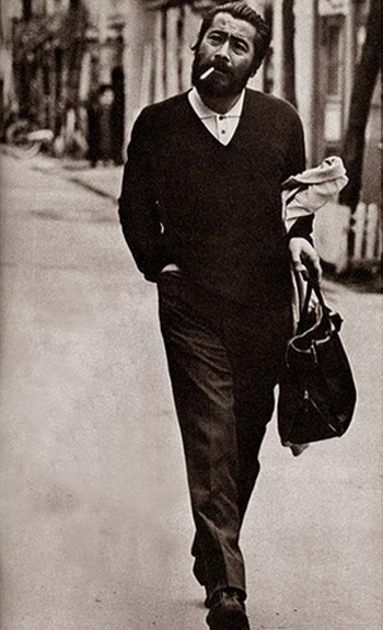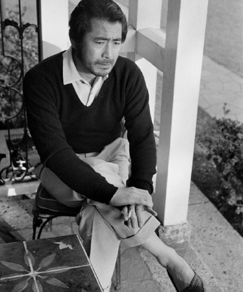Mifune often wore a white polo shirt – short or long-sleeved – with cuffed trousers that aren’t too baggy or too skinny. Sometimes, he will layer a dark (presumably navy, charcoal or black) v-neck sweater over his polo.