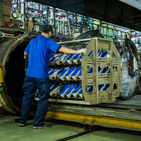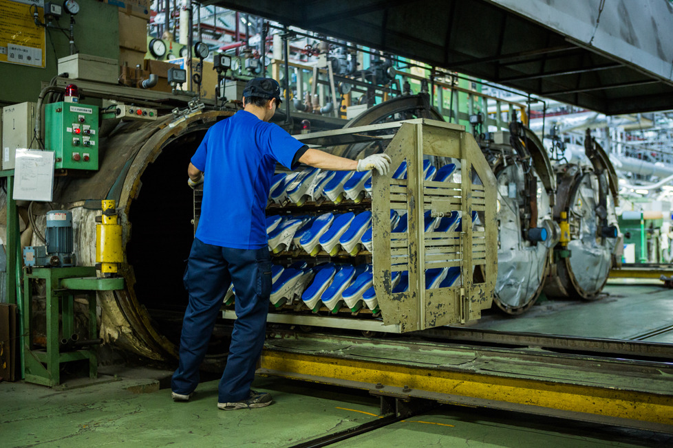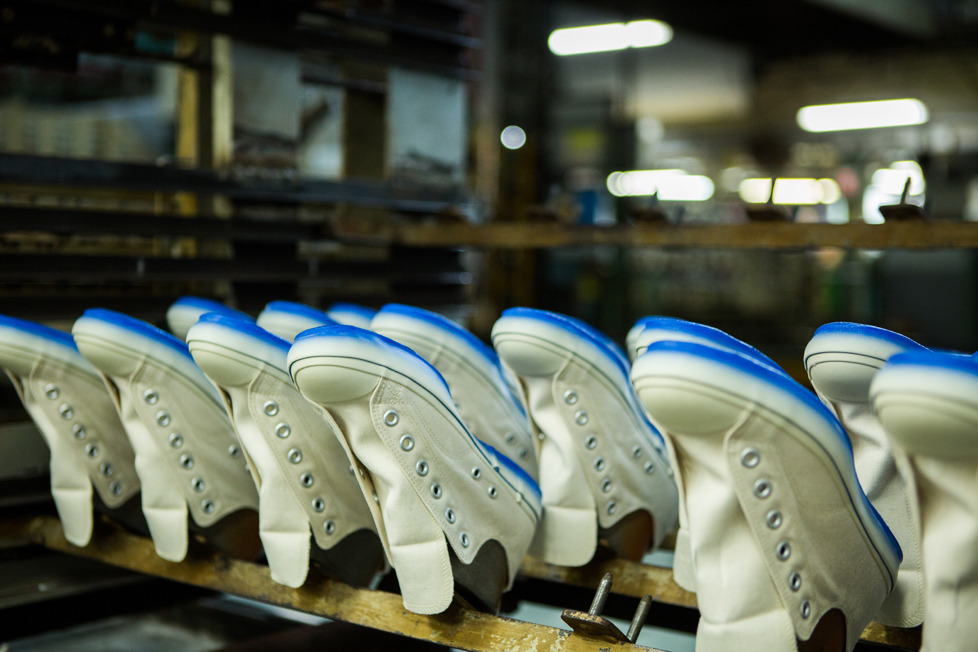 Eyescream has a neat photo essay up on the Moonstar Manufacturing factory in Kurume, Japan. Moonstar makes pretty basic sneakers distinguished mostly by the fact that they use a traditional vulcanization method: shoe soles are bonded (glued, essentially) to uppers with a wrapped piece of rubber tape, then baked in a kiln, enabling a chemical reaction that seals the sole, tape, and upper. Before I saw the eyescream piece I don’t think I’d ever considered what a vulcanization kiln might look like. Moonstar doesn’t currently sell self-branded shoes outside of Japan, but they own/make Shoes Like Pottery and have made shoes for Stussy, for example.
