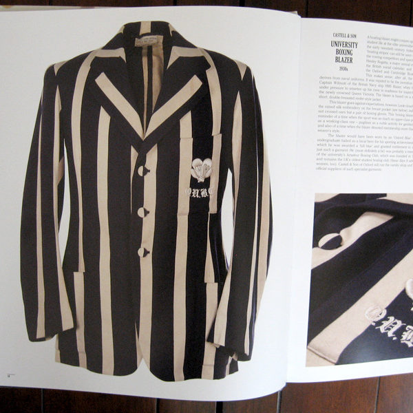 The book’s 304-pages are divided into three sections: Sports & Leisure, Military, and Workwear. Each section shows fifty or so odd garments, almost all from the early- to mid-20th century. Some are particularly interesting. Take, for example, what seems to be a boldly striped boating blazer in the Sports & Leisure section. On closer inspection, instead of two crossed oars embroidered at the chest pocket (as is common on boating blazers), we see a pair of boxing gloves. It turns out this is a “university boxing blazer,” and was worn at a time when boxing was considered as much of an upper-class sport as a working-class one. “Pugilism as a noble activity for gentlemen,” the book’s author writes. An undergraduate student recognized as a local hero for his sporting accomplishments would be allowed to wear this lively blazer around campus. Much more impressive than the campus-store bought sweatshirts and sweatpants that college athletes (some Olympians) wear today.