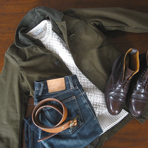 (Pictured above: sweaters and coats as described; straight legged 14.5oz selvedge denim jeans from 3sixteen; undyed thick harness leather belt from Don’t Mourn Organize, made with a buckle bought at Slash Clothing; and shell cordovan boots from Brooks Brothers)