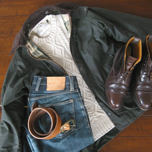 Each of these lack the kind of bells and whistles that can make an outfit interesting, so to balance things out, I sometimes layer in some heavy, textured knitwear. Above are some examples. Underneath the pea coat is a very subtly textured, black Shetland, which is also from last season’s Barbour x Norton & Sons range. Underneath the LL Bean Signature barn coat and waxed cotton Bedale are some heavy, cream-colored sweaters, which are from Inis Meain. The first is a basket weave sweater that’s been made with an open interlocking lacing on the front body. The second is your standard cable knit Aran, although done to Inis Meain’s design. Finally, underneath the brown field coat is also an Aran from Inis Meain, but this time, in navy. The pairing of blue jeans and a navy sweater can sometimes look off, but the jeans here, I think, are light enough that there’s enough contrast.