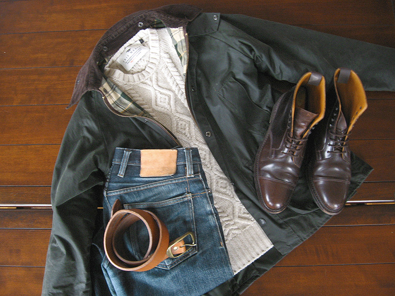 Each of these lack the kind of bells and whistles that can make an outfit interesting, so to balance things out, I sometimes layer in some heavy, textured knitwear. Above are some examples. Underneath the pea coat is a very subtly textured, black Shetland, which is also from last season’s Barbour x Norton & Sons range. Underneath the LL Bean Signature barn coat and waxed cotton Bedale are some heavy, cream-colored sweaters, which are from Inis Meain. The first is a basket weave sweater that’s been made with an open interlocking lacing on the front body. The second is your standard cable knit Aran, although done to Inis Meain’s design. Finally, underneath the brown field coat is also an Aran from Inis Meain, but this time, in navy. The pairing of blue jeans and a navy sweater can sometimes look off, but the jeans here, I think, are light enough that there’s enough contrast.