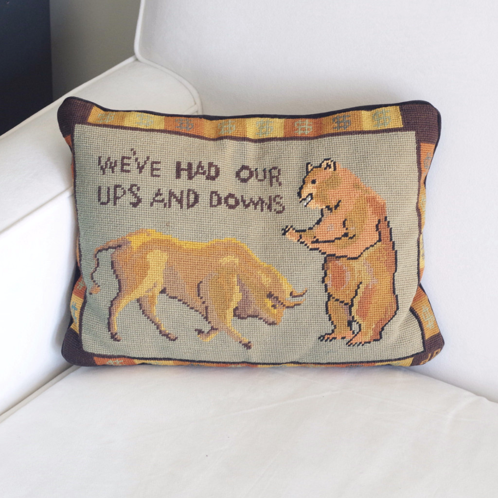 - A needlepoint throw pillow with a bull and bear fighting it out on Wall Street.