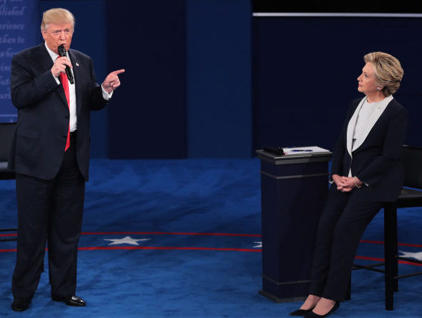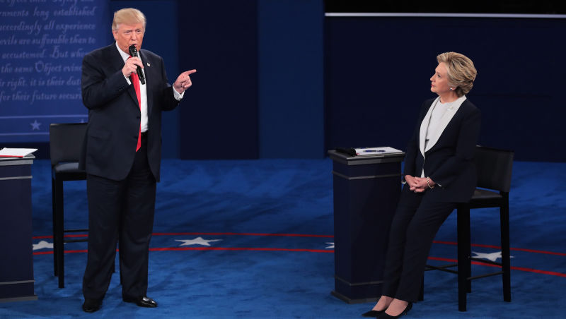 - Pants: We like full-legged trousers, but Trump’s are so large that they make his feet look small by comparison. You can see this in the photo where he debates Hillary Clinton. The pants could be a little trimmer.